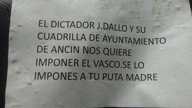 Aparecen en Ancín panfletos anónimos insultando al alcalde y en contra del euskera.