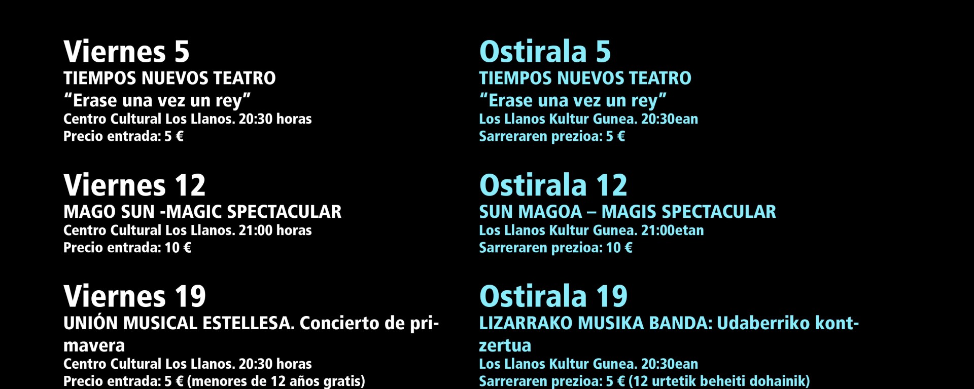 El departamento de Cultura del Ayuntamiento de Estella acaba de dar a conocer la programación de los “Eventos Culturales” antes llamados “Viernes Culturales”.