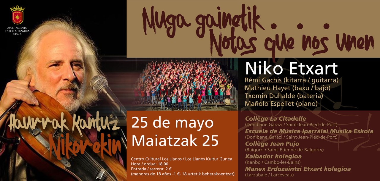 El Ayuntamiento de Estella-Lizarra, dentro de los actos de hermanamiento con la ciudad bajonavarra de Donibane-Garazi (Saint-Jean-Pied-de-Port), ha organizado para el día 25 de mayo, festividad de la Virgen del Puy, un concierto a cargo del conocido músico y compositor Niko Etxart, que contará con el acompañamiento de Rémi Gachis (guitarra eléctrica), Mathieu Hayet (bajo), Txomin Duhalde (batería) y Mañolo Espellet (piano) y alrededor de 120 alumnos de diferentes escuelas de Donibane-Garazi y otras poblaciones cercanas.