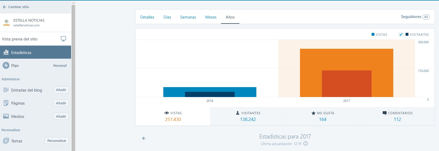 Los seguidores en facebook se acercan a los 2.600 y en la web https://estellanoticias.com/ solo en lo que llevamos de año se acumulan más de un cuarto de millón de visitas. Concrétamente a fecha de hoy han quedado registradas 251.430 vistas que se corresponden con 138.242 visitantes.