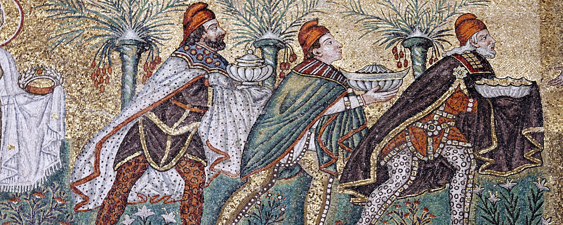Para la centena siguiente ya aparecen recreados por un mosaico sobre San Apolinar Nuovo de Rávena. En él, tres hombres blancos vestidos a la usanza persa, con túnica y gorro frigio, entregan presentes a la Virgen y el niño. Sobre sus cabezas sobrevuela el escrito «Gaspar, Melchior y Balthassar».