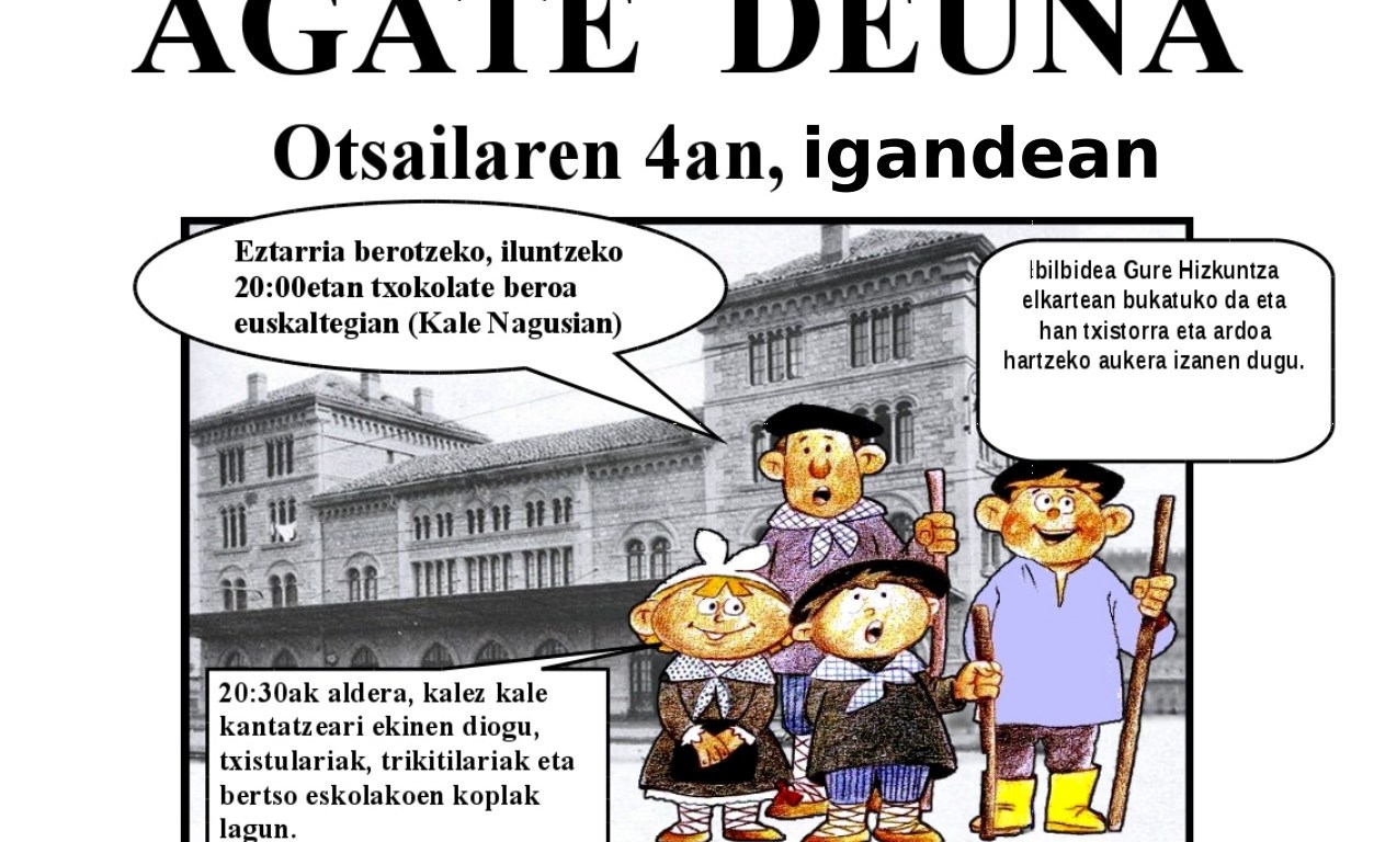 Urte honetan ere iritsi zaigu Agate eguna eta urtero bezala, Lizarrako euskaltegitik deialdia luzatuko diogu jendarteari gurekin abestera eta momentutxo eder bat pasatzera hurbiltzeko. Txokolatea banatuko dugu lehenik euskaltegian bertan, Kale Nagusian. Ondoren kalejiran joango gara, bertsolariek lagundurik, Gure Hizkuntza elkarteraino. Gure hizkuntzan askaritxo bat egingo dugu eta bukaera emango diogu jaiari.