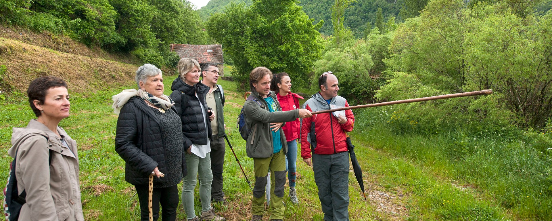 PIE DE FOTO. En la imagen, de izquierda a derecha, Estefanía Munarriz jefa Sección Desarrollo del Producto Turístico; Ángel Mari Loperena, teniente de alcalde de Garralda; Karmele Galarza, juntera del Valle de Aezkoa; el vicepresidente Ayerdi; la directora general de Turismo y Comercio, Maitena Ezkutari; Carlos Bueno Reka; Koldo Villalba, guía Itari Natura; Nieva Uriz, técnica de Turismo y Edurne De Miguel, agente de Cederna-Garalur.