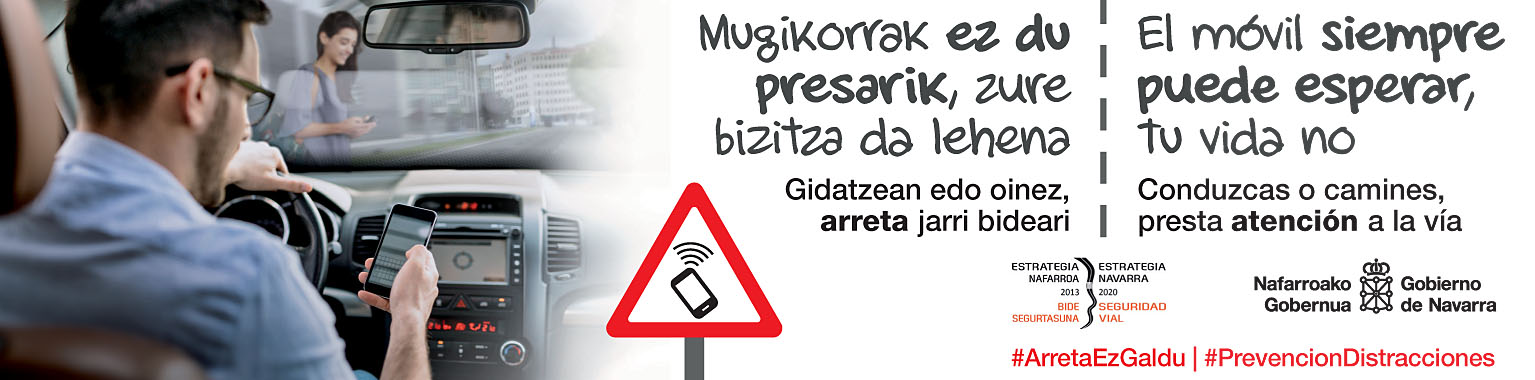 El Gobierno de Navarra inicia hoy una campaña institucional contra las distracciones al volante, destinada principalmente a conductores, pero también a peatones y ciclistas. Su slogan, El móvil siempre puede esperar, tu vida no, pretende hacer reflexionar sobre el peligro que supone leer o escribir un mensaje en el móvil mientras se está conduciendo.