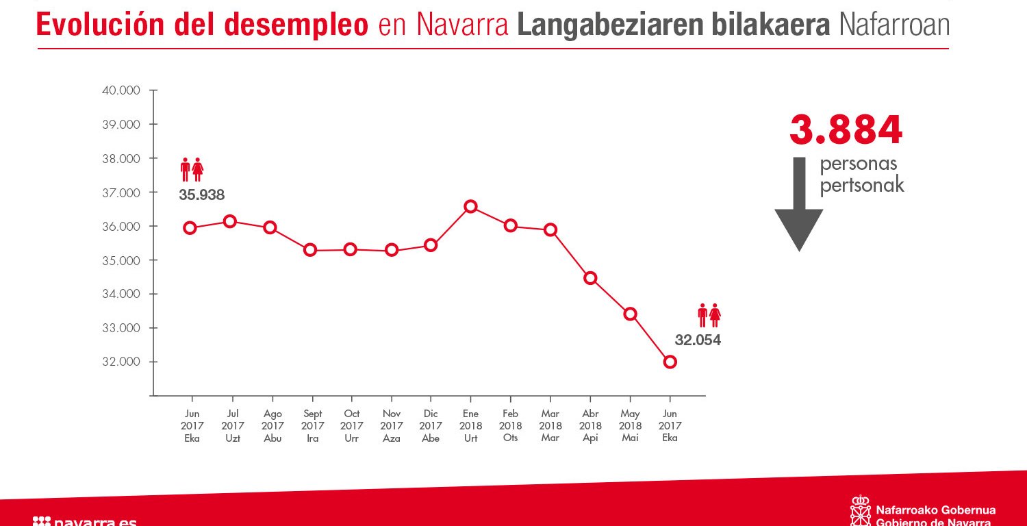 El paro en Navarra consolida su trayectoria descendente al contabilizar el mejor dato registrado en un mes de julio desde antes de la crisis económica, con un descenso de 1.282 personas, lo que supone un descenso de 3,82% en un solo mes situándose la cifra global en niveles similares a finales de 2008. La Comunidad Foral es la comunidad autónoma en la que más baja el paro en los últimos 12 meses y la cuarta que más empleo crea.