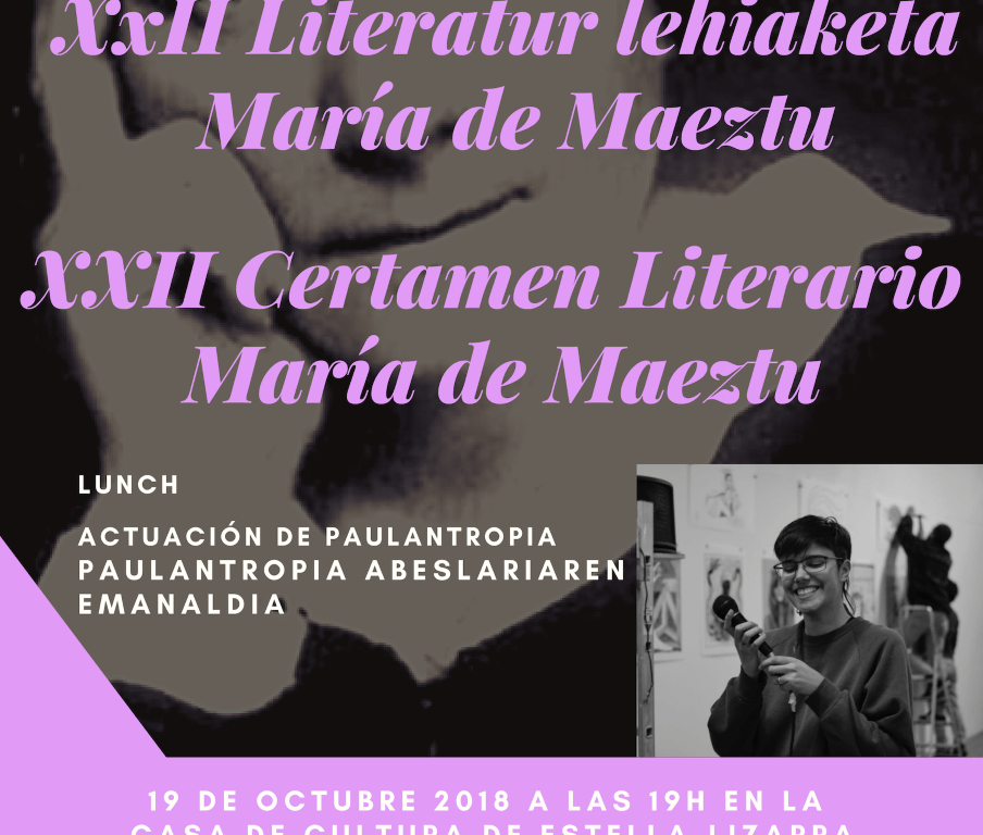 Este viernes 19 de octubre a las 19h, tendrá lugar en la Casa de Cultura de Estella-Lizarra, la entrega de los premios del XXII Certamen literario María de Maeztu organizado por la Asamblea de Mujeres de Estella-Lizarra con la colaboración del Ayuntamiento y el Área de Igualdad.