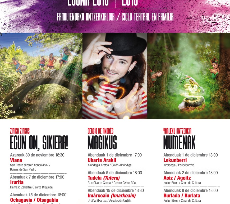 Tres montajes teatrales para público familiar van a servir de celebración del Día Internacional del Euskera, que se conmemora el 3 de diciembre. El Gobierno de Navarra, a través de Euskarabidea, ha organizado desde este viernes este ciclo que va a recorrer diez localidades de la Comunidad Foral ofreciendo tres espectáculos teatrales en euskera para disfrutar en compañía de niños y niñas. Este viernes, en … Continúa leyendo Un ciclo teatral para público familiar en localidades de toda Navarra celebra el Día Internacional del Euskera