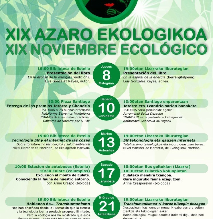 El martes 13 en la Biblioteca se celebraráuna charla sobre «Tecnología 5G y el Internet de las cosas». Tratará sobre el totalitarismo tecnológico y la salud ambiental. con Mikel Martinez de Morentin, arquitecto especializado en bioconstucción y miembro de Ekologistak Martxan.