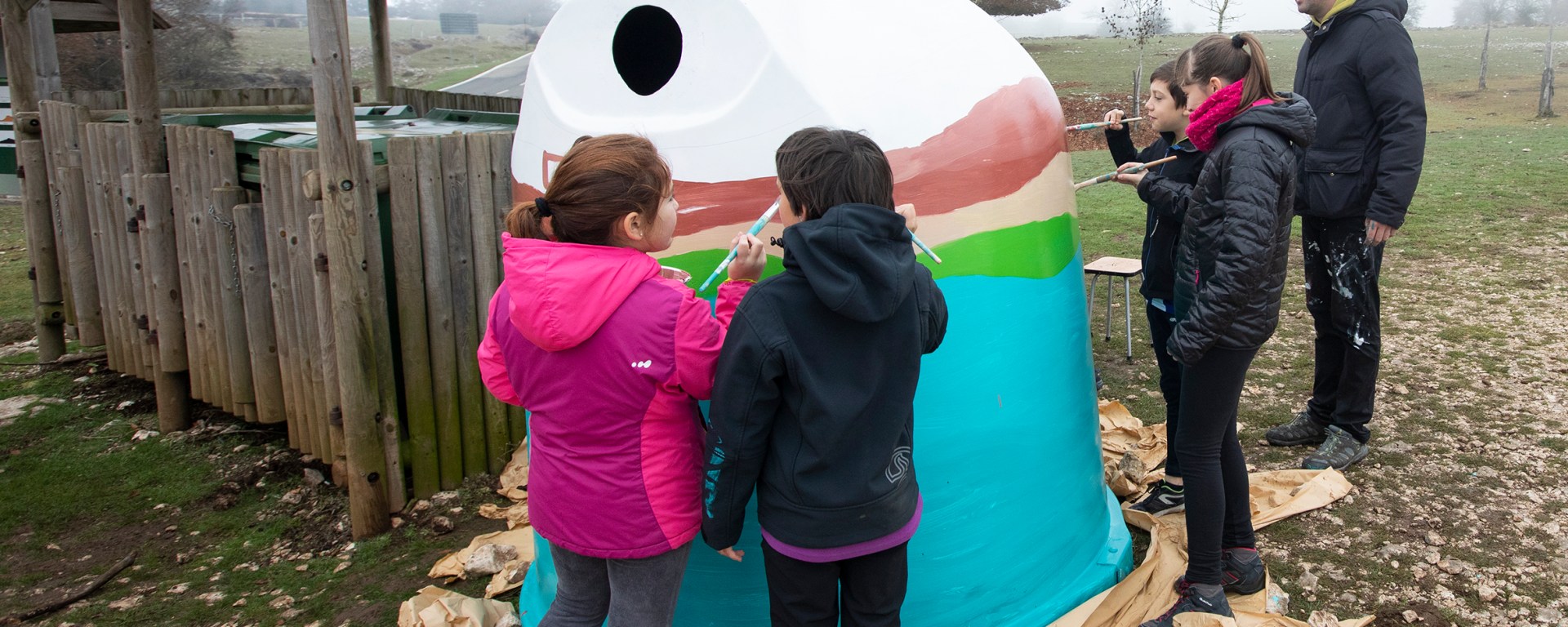 50 niños y niñas del Colegio Público Las Améscoas de Zudaire han realizado hoy la acción artística ¡En el Parque de Urbasa-Andia compostamos y reciclamos!, con el fin de visibilizar los cambios efectuados en la gestión de residuos en el Parque natural de Urbasa-Andia , en línea con la nueva Ley Foral de Residuos. Previamente han participado en talleres de concienciación y han podido visitar una compostadora de las instaladas en el Parque.