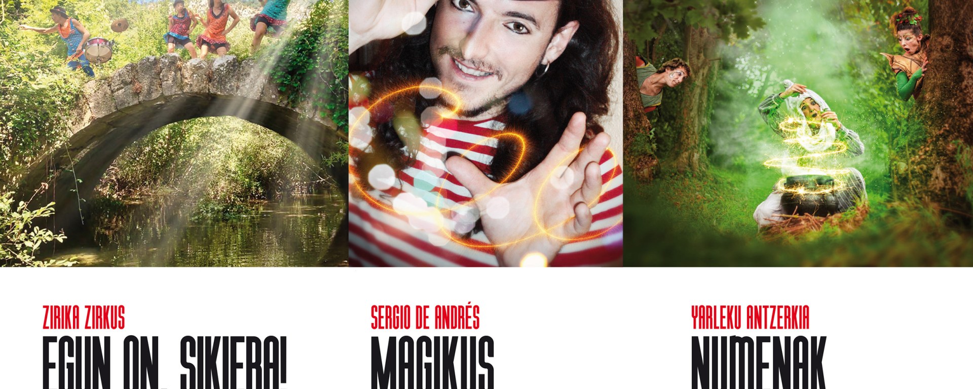 Las tres compañías navarras que ofrecerán sus actuaciones en el ciclo son Zirika Zirkus, Sergio de Andrés y Yarleku antzerkia. Todas las sesiones serán en euskera, la entrada será libre y tendrán una duración de 60 minutos. Conviene consultar la siguiente programación, teniendo en cuenta que no todos los montajes se representan en todas las localidades.