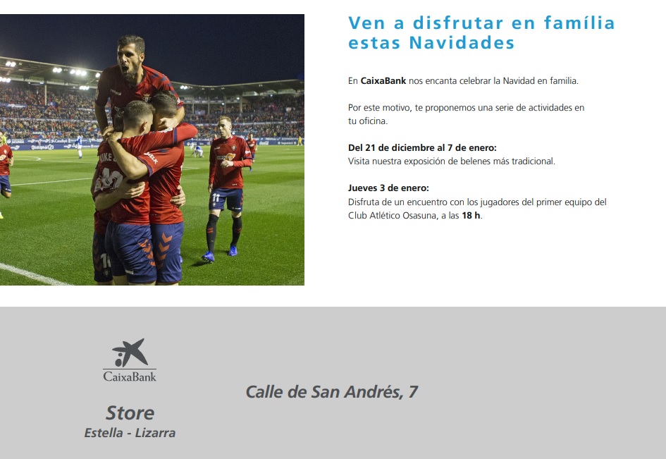 La oficina Store San Andrés de Estella-Lizarra acogerá mañana un acto de encuentro entre jugadores de Osasuna y clientes de CaixaBank.