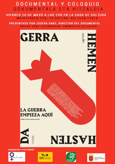 Organizado por la Asamblea de Mujeres de Estella-Lizarra, Estella Ciudad de Acogida y Ekologistak Martxan, este viernes, 10 de mayo a las 7 de la tarde en la casa de cultura Fray Diego, tendrá lugar la proyección del documental titulado La guerra empieza aquí. El propio director, Joseba Sanz, será el encargado de realizar la presentación.