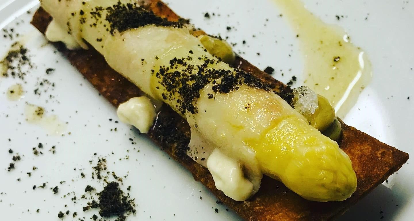 El espárrago se adereza con una vinagreta suave de almendras tostadas, acompañando cada uno de los tres bocados con una papada ibérica de bellota que, previamente se ha cocinado a baja temperatura, una tierra de trompetas de la muerte -en realidad es una pasta quebrada de pastelería, en la cual se ha sustituido la harina por las setas tostadas al horno, trituradas, mezcladas con azúcar y mantequilla. Una vez elaborada la pasta, se congela enrulada, se ralla con un microplane y se seca al horno-, un cremoso de hígado de pato perfumado al vino oloroso y un helado cremoso de cebolla caramelizada.