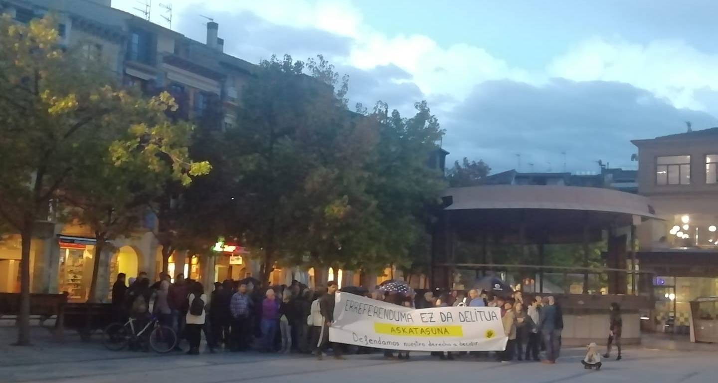 La concentración de esta tarde, que ha sido vigilada discretamente por una patrulla de la Guardia Civil, integrada por dos agentes, se ha desarrollado sin incidentes. En la pancarta, que dominaba la escena, se podía leer: «Erreferenduma ez da delitua. Askatasuna. Defendamos nuestro derecho a decidir».