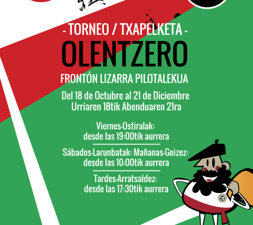 El viernes 18 de Octubre dará comienzo el Torneo OLENTZERO del 4 1/2. Este año parte con novedades ya que hay tercera categoría debido al aumento de participantes, 42 pelotaris tomarán parte entre 1ª, 2ª y 3ª. Se mantiene el sistema de juego de los JOKOS para darle más emoción e interés al torneo. Los partidos se jugarán viernes y sábado en el FRONTÓN LIZARRA … Continúa leyendo Arranca el Torneo pelotazale Olentzero