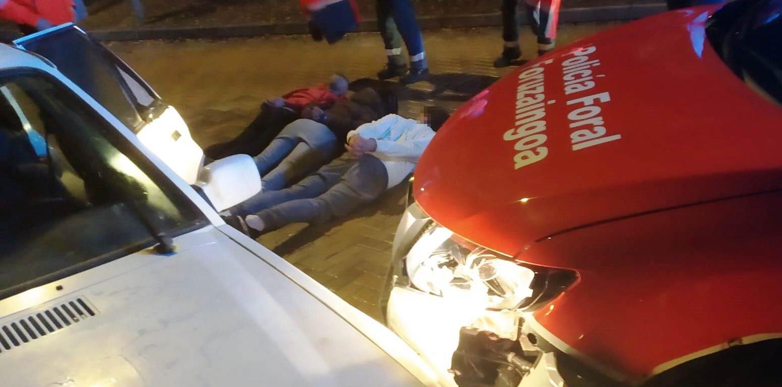 En ese breve espacio de tiempo, y con la colaboración de otra patrulla de Seguridad Vial de la Policía Foral, se estableció un dispositivo para intentar detener a los fugados. Nuevamente el conductor del vehículo hizo caso omiso a las indicaciones de los agentes para que se detuviera, teniendo uno de los policías que saltar a un lado para evitar ser atropellado. Tras callejear por las calles de Gorraiz el conductor perdió el control del vehículo, hizo un trompo y colisionó con el vehículo patrulla de Seguridad Ciudadana que le perseguía.