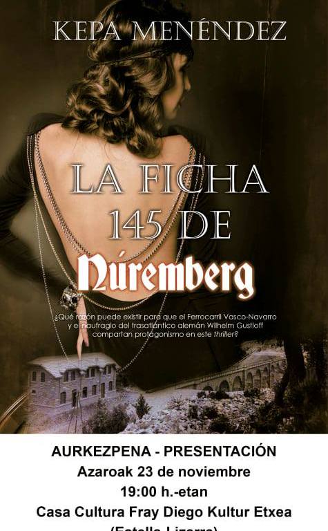 “La Ficha 145 de Núremberg” es un thriller ambientado en Tierra Estella y la Montaña Alavesa que aúna los últimos días del Ferrocarril Vasco-Navarro y el mayor naufragio de la historia, el del trasatlántico alemán M.S. Wilhelm Gustloff, así como los episodios más trascendentes de la Segunda Guerra Mundial.