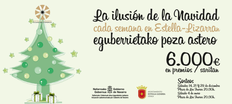 La Asociación de Comerciantes de Estella ha presentado la Campaña Navideña, que tiene las siguientes características: Sorteo de 6.000 euros en premios, Se realizará un sorteo durante 4 semanas, los días 14 de diciembre (SÁBADO, 1º SORTEO): sorteo de un premio de 1.000 € y dos premios de 250 € canjeables por compras, 21 de diciembre (SÁBADO, 2º SORTEO): sorteo de un premio 1.000 … Continúa leyendo “La Ilusión de la Navidad, Cada Semana en Estella-Lizarra”
