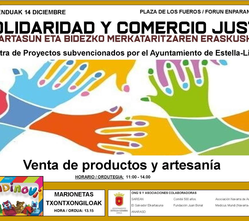 Este sábado día 14 de diciembre tendrá lugar la Muestra de Solidaridad y Comercio Justo 2019 en la plaza de los Fueros en horario de 11:00 a 14:00 y en la que participaran diferentes colectivos y ONG´s que realizarán una muestra de los proyectos subvencionados este año por el Ayuntamiento de Estella-Lizarra así como venta de productos y artesanías. También tendrá lugar una representación … Continúa leyendo La Plaza de los Fueros acoge este sábado la Muestra de Solidaridad y Comercio Justo