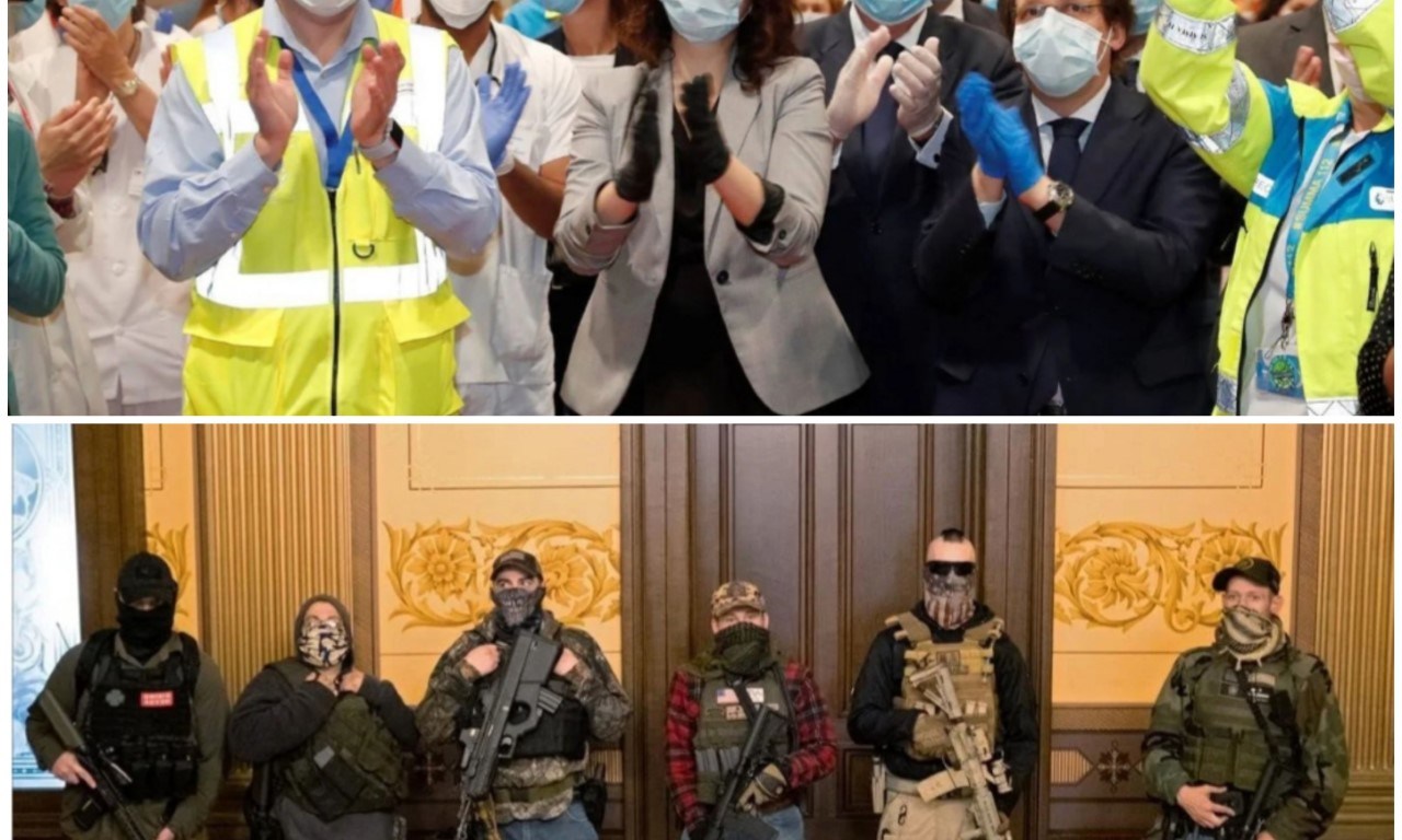 Michigan es uno de los estados más afectados por el coronavirus, la Comunidad de Madrid también, en Michigan hoy una panda de descerebrados armados han entrado en el capitolio de la capital del estado para coaccionar a la gobernadora a que levantara el confinamiento.