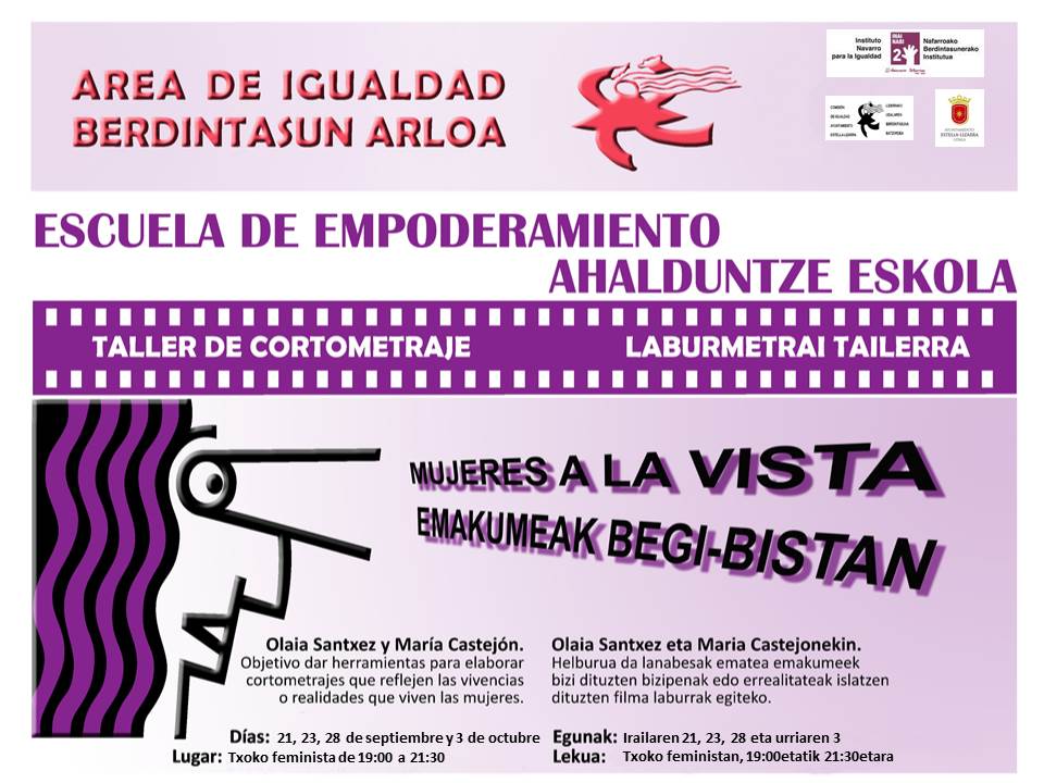 Este septiembre regresa el taller de cortometrajes ‘Mujeres a la vista’ con el objetivo de dar herramientas para elaborar cortometrajes que reflejen las vivencias o realidades que viven las mujeres. Lo impartirán Olaia Santxez y María Castejón los días 21,24 y 28 de septiembre, de 19.30 a 21.00 horas, en el Txoko Feminista. El 3 de octubre será el rodaje.