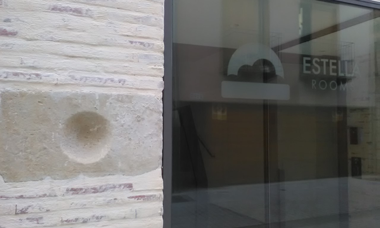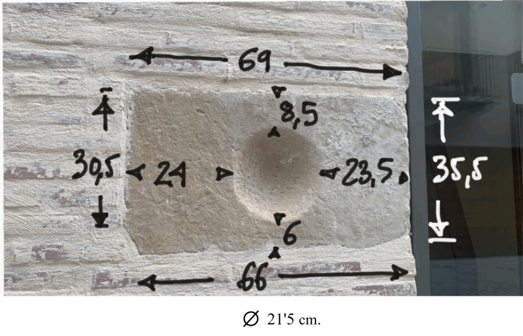 La piedra colocada en la fachada del establecimiento de hostelería sito en la misma calle, pero en los portales nos. 3-5, y que ha sido el origen de la polémica presenta similitudes formales con la que integraba el lagar arriba descrito. Pero hay algunas diferencias. Sus dimensiones máximas son 35,5 cm. de anchura, 69 cm. de longitud y el pocillo tiene un diámetro de 21 cm. 3 . Es decir, es notablemente más pequeña; es otra piedra, muy parecida, eso sí. La procedencia de esta pieza está en un conjunto inconexo de materiales constructivos presentes en el edificio derruido.