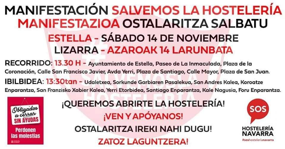 Los hosteleros de Estella-Lizarra saldrán mañana a las calles para evidenciar su malestar por el cierre de sus negocios ordenado por el gobierno de Navarra hace más de tres semanas y que tiene previsto continuar hasta, por lo menos, el día 18 de noviembre. La protesta partirá a las 13,30 h desde el Ayuntamiento para recorrer a continuación el Paseo de la Inmaculada, plaza de la Coronación, San Francisco Javier, Avenida de Yerri, plaza de Santiago, calle Mayor y plaza de Los Fueros, lugar este último que acogerá el mercado Plazará y el de la Vía Verde.