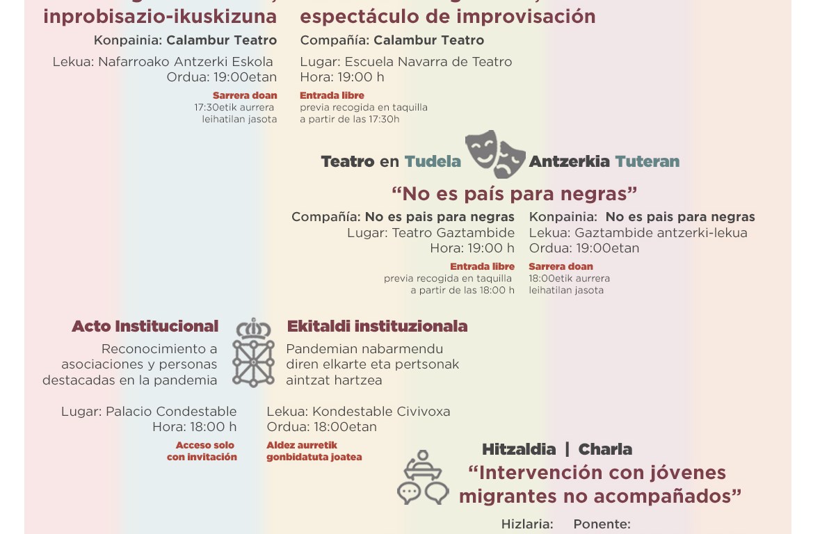 Así, en Pamplona y en Tudela habrá sendas funciones teatrales, con entrada libre previa recogida en las taquillas de las instalaciones donde se representarán. En Pamplona, la compañía Calambur Teatro ofrecerá un espectáculo de improvisación bajo el título “Impro-visado, retazos de migración”, a partir de las 19:00 horas en la Escuela Navarra de Teatro. La entrada es libre, previa recogida en taquilla a partir de las 17:30, hasta completar el aforo máximo permitido.