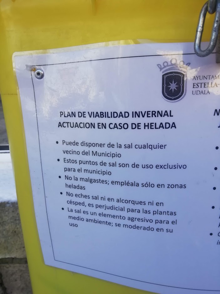 Ha nevado en Estella-Lizarra y desde el punto de la mañana, los operarios del servicio de limpieza y del propio ayuntamiento se han afanado en dejar limpias aceras, calles y travesías, pero se les ha debido olvidar las aceras del Puente del Azucarero. Tal y como se aprecia en la imagen, tomada este mediodía de lunes, el vecindario se ve obligado a caminar invadiendo la carretera para evitar riesgos y resbalones. Llama la atención que todos los contenedores de sal, puestos al servicio de la ciudadanía permanecen cerrados con cadenas y candados(?).