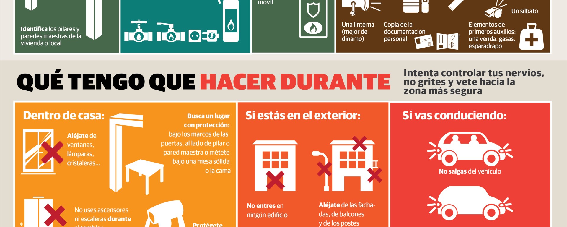 En lo que respecta a las actuaciones a seguir durante un terremoto, si tiene lugar en el interior de un domicilio, se debe buscar un lugar protegido (bajo los marcos de las puertas, junto a un pilar, bajo una mesa sólida o una cama). Asimismo, no se deben utilizar ascensores ni escaleras durante el temblor y es conveniente alejarse de las ventanas, lámparas o cristaleras. Si el terremoto tiene lugar en el exterior, no se debe entrar en ningún edificio y, en el caso de estar conduciendo, no hay que salir del vehículo, es aconsejable encender las luces de emergencia y aparcar en un lugar alejado de puentes.