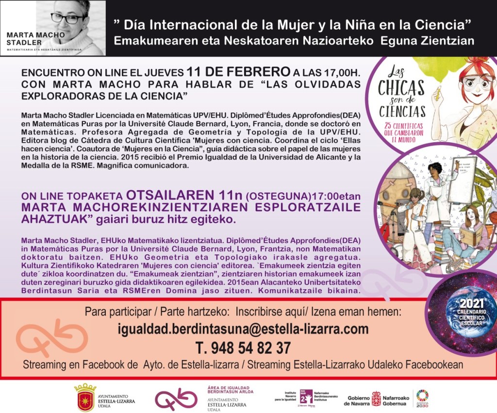 Este próximo jueves, día 11 de febrero, se celebra el Día Internacional de la Mujer y la Niña en la Ciencia. Por ese motivo, el Área de Igualdad del Ayuntamiento de Estella-Lizarra ha organizado un en cuentro on-line a las 17.00 horas con Marta Macho para hablar de ‘Las olvidadas exploradoras de la ciencia’.