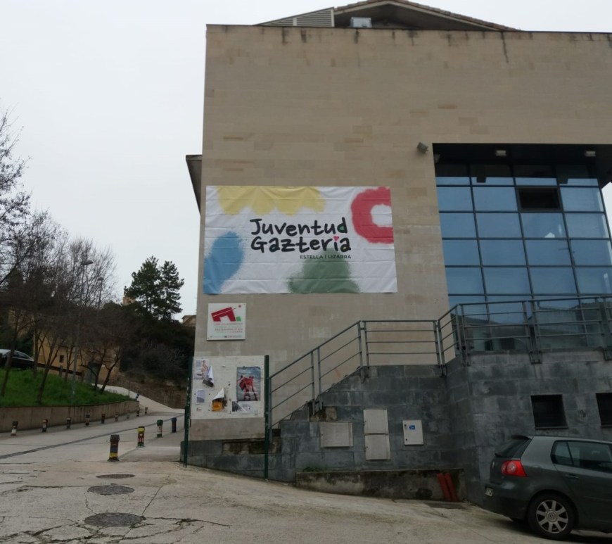 Una gran lona con el nuevo logo del Área de Juventud del Ayuntamiento de Estella-Lizarra, diseñado por Óscar Rubio, cuelga desde hoy de la fachada de la Casa de la Juventud María Vicuña. Se trata de una lona de 5,40 metros de base y 3,30 de altura en la que se puede apreciar a distancia la nueva imagen que desde la concejalía de Juventud se … Continúa leyendo Una gran lona con el nuevo logo del Área luce ya en la fachada de la Casa de la Juventud