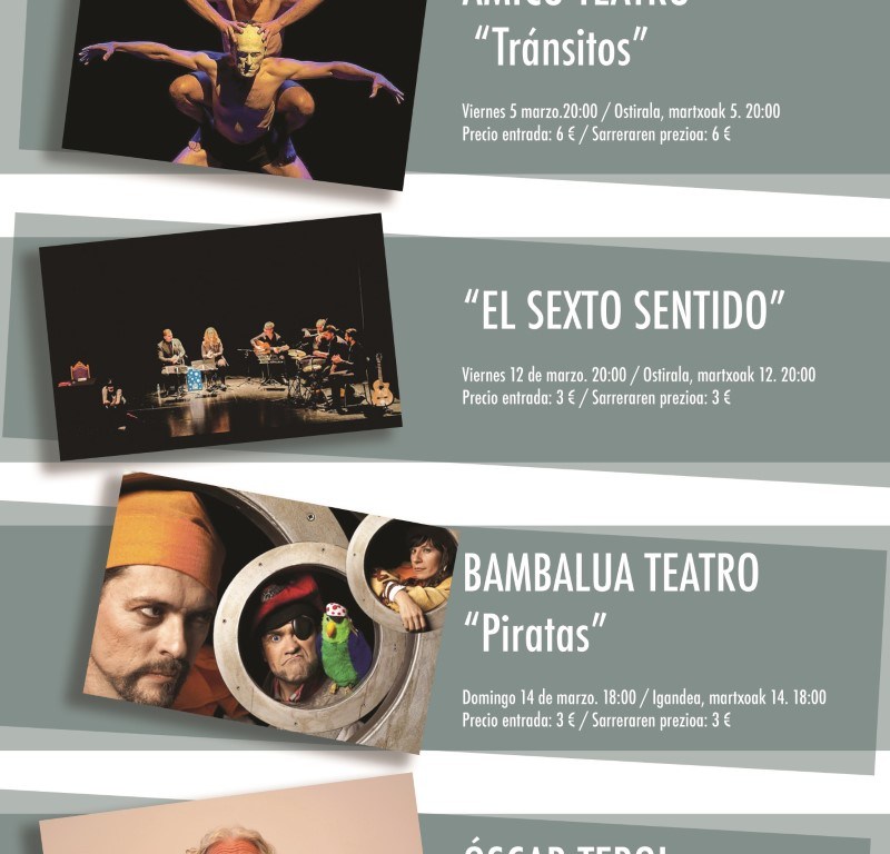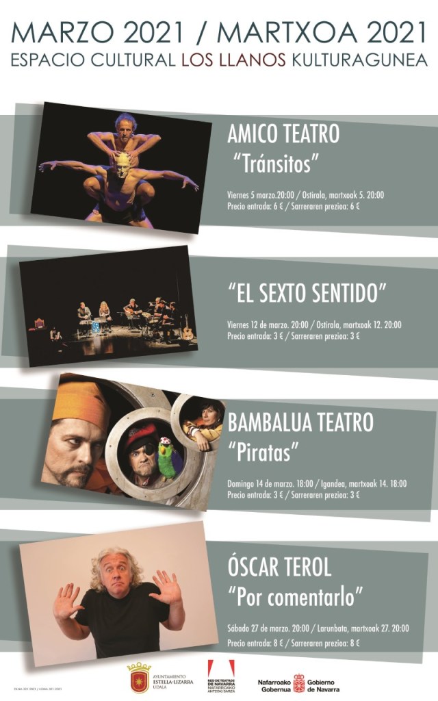 Todos los espectáculos se han organizado desde el departamento de Cultura del Ayuntamiento de Estella-Lizarra, salvo el del día 12, que se ha programado desde el Área de Igualdad. Las entradas se pueden adquirir por Internet, en los tótem o en la cafetería del Espacio Cultural.