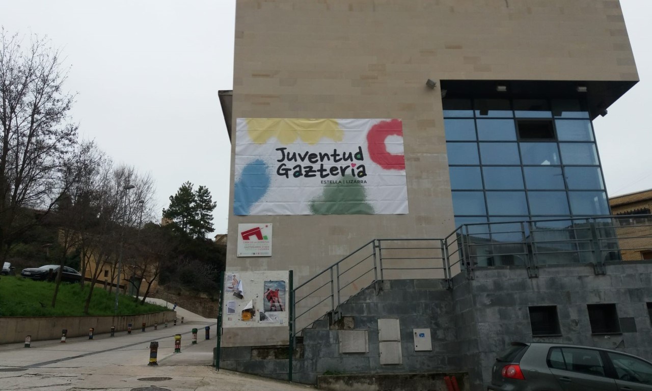 Una gran lona con el nuevo logo del Área de Juventud del Ayuntamiento de Estella-Lizarra, diseñado por Óscar Rubio, cuelga desde hoy de la fachada de la Casa de la Juventud María Vicuña. Se trata de una lona de 5,40 metros de base y 3,30 de altura en la que se puede apreciar a distancia la nueva imagen que desde la concejalía de Juventud se ha impulsado para el Área.