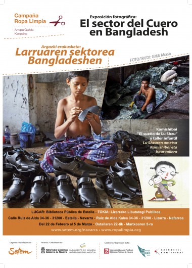 La exposición lleva por título “El sector del cuero en Bangladesh”. El proyecto está financiado por el Gobierno de Navarra y en colaboración con la red de Bibliotecas de Navarra, permite acercar la realidad de los países productores de ropa y calzado a las bibliotecas de nuestra comunidad, para sensibilizar sobre la explotación de la industria textil y del calzado . A través de 12 fotografías y testimonios de las personas que trabajan en la cadena de suministro del textil y calzado, la exposición aborda diferentes temáticas relacionadas con la alta toxicidad medioambiental de esta industria: la separación familiar, los salarios bajos, las condiciones de las mujeres en el trabajo, el trabajo infantil o la responsabilidad de las empresas en accidentes y conflictos laborales.
