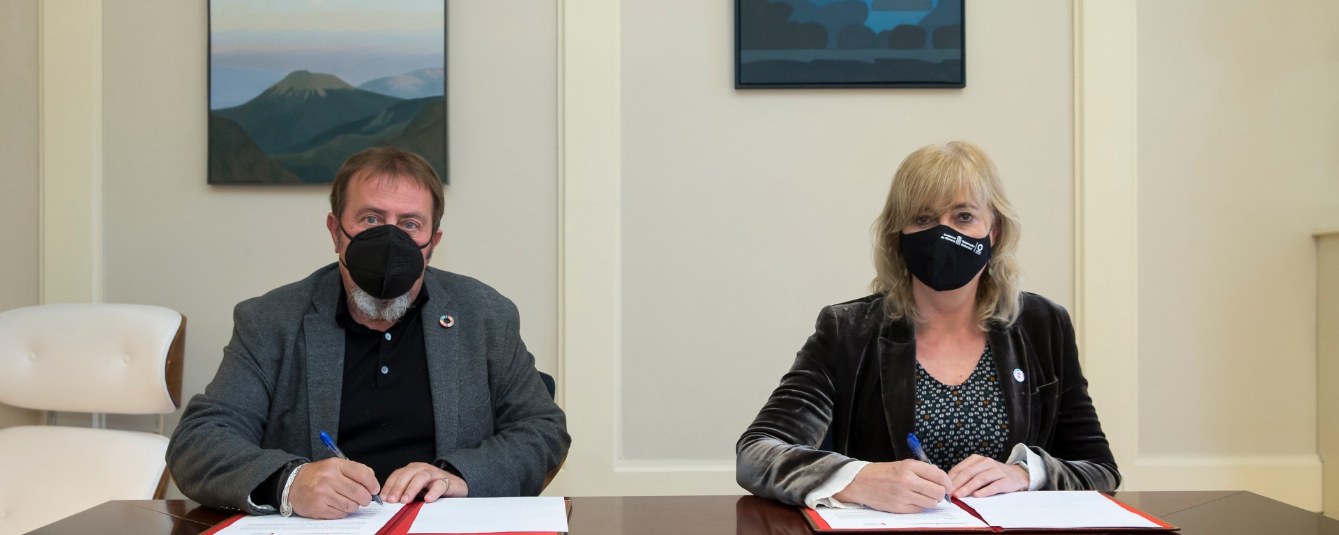 La consejera de Relaciones Ciudadanas, Ana Ollo, y el presidente de la Fundación Francisco Largo Caballero, Sebastián Pacheco, han firmado esta mañana un convenio de colaboración para realizar actividades conjuntas relacionadas con el impulso de la memoria histórica y la atención a las víctimas del franquismo en Navarra. A través de este convenio se quiere reforzar las políticas de memoria, especialmente las referidas a las víctimas del sindicato UGT que sufrieron represalias o muerte como consecuencia del golpe militar de 1936, de la Guerra Civil y de la represión de la dictadura franquista.