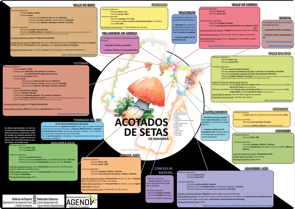 En la página web del Departamento de Desarrollo Rural y Medio Ambiente se recoge esta información sobre Acotados de Setas de Navarra y la normativa que regula la recolección , así como las condiciones para la recogida de hongos, información gráfica sobre los acotados y el enlace a los mapas que ilustran los montes afectados por estas regulaciones, que se puede visualizar en IDENA.