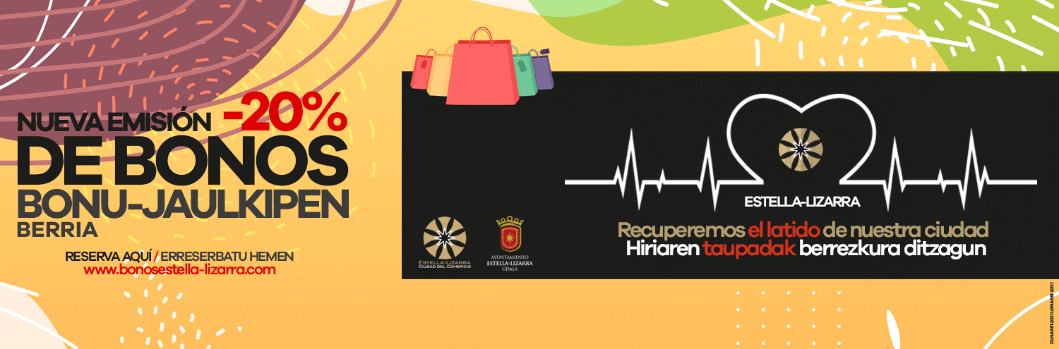 Se trata de una nueva emisión de bonos para apoyar al comercio, hostelería y servicios de Estella-Lizarra, gracias al apoyo del Ayuntamiento de Estella-Lizarra.