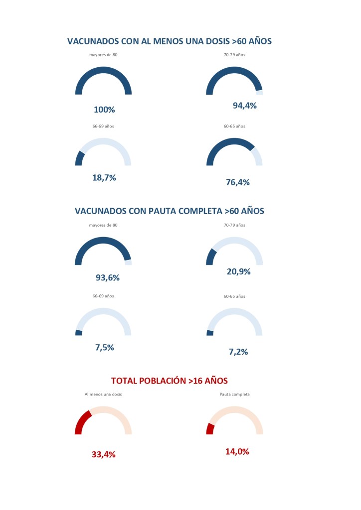 En estas franjas de edad superior a los 60 años, además, se ha completado la pauta al 93,6 de los mayores de 80 años y al 20,9 de los de 70 a 79 años. Además, tienen la pauta completa el 7, 5 de los de 66 a 69 años y el 7,2 de los de 60 a 65 años.