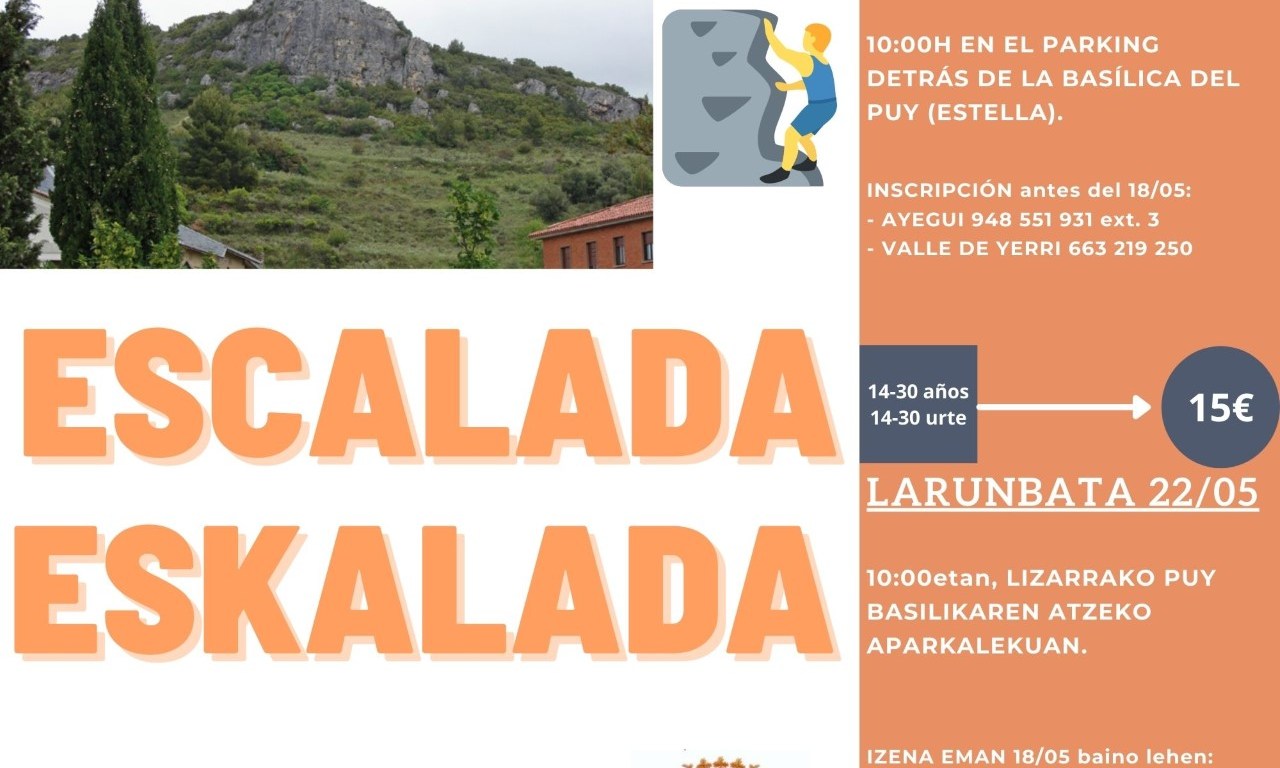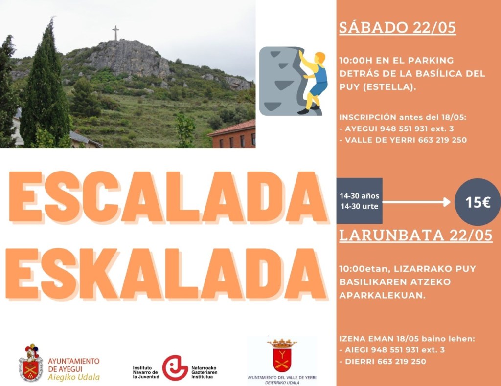 El sábado 22 de mayo los jóvenes de Ayegui tendrán una actividad de escalada a las 10:00h organizada junto al Ayuntamiento de Valle de Yerri y Mugitu, y por la tarde, habrá una exhibición de arte con motosierra con Mikel Lasarte. Por último, el sábado 29 de mayo Maite Redín ofrecerá un espectáculo feminista, reivindicativo y divertido titulado “Fotos, hormonas y lexatin”.