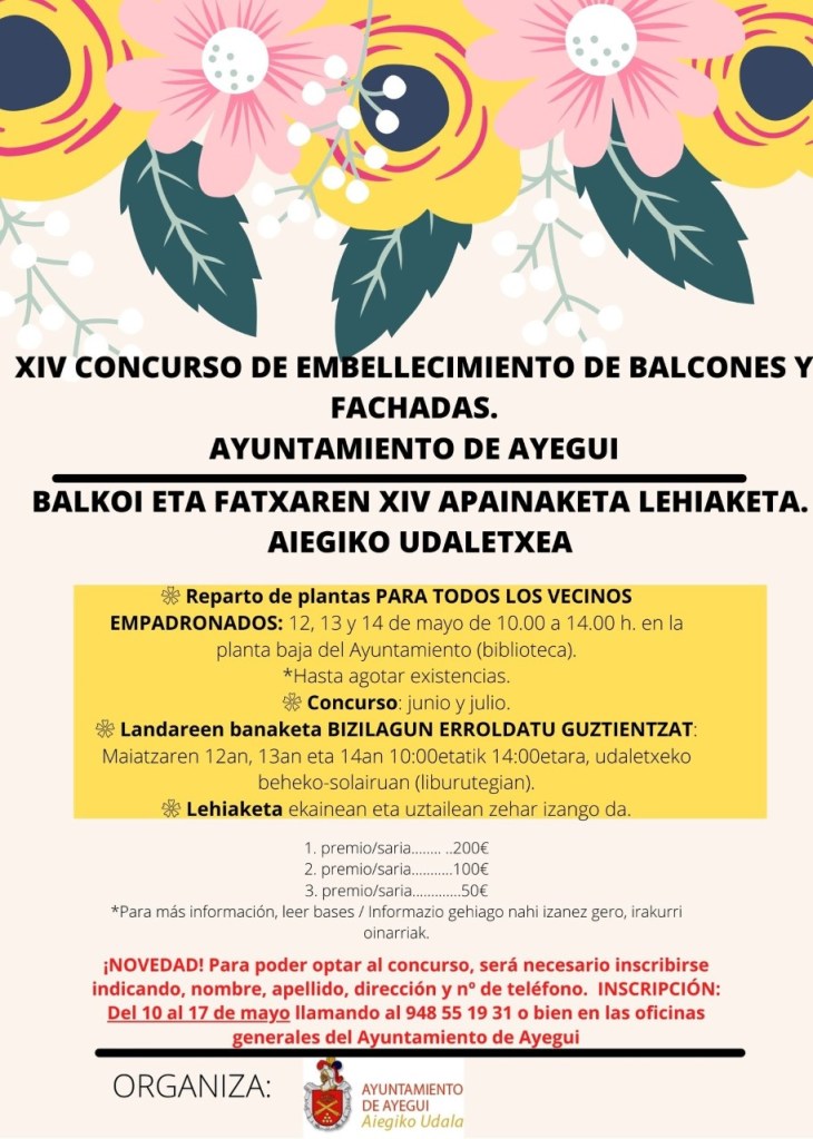 Ayegui llega cargado de actividades para este mes de mayo. Ya se ha presentado el tradicional concurso de embellecimiento de balcones y fachadas. Las bases del concurso estarán disponibles en la página web del ayuntamiento (https://www.ayegui.org/ ). Este domingo 9 de mayo, dará comienzo el curso de plantas medicinales y aromáticas para el autocuidado con Laura Gurbindo. Por otro lado, el 15 de mayo tendrá lugar en la biblioteca municipal una sesión de cuentacuentos infantil con Myriam Cordón a las 18:30h.