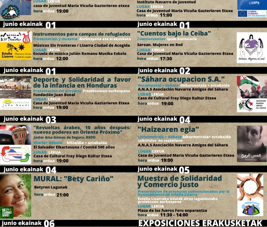 Organiza y colaboran: Comisión de Juventud y Solidaridad del Ayuntamiento, El Salvador Elkartasuna, Comité 500 años, Asociación Navarra Amigos del Sahara (ANAS), Lizarra Ciudad de Acogida- Lizarra Harrera Hiria, Fundación Juan Bonal, Bety-ren lagunak, Mugarik Gabe, Fundación RODE, SOS Himalaya y la Asociación Navarra de Amigos de la R.A.S.D e Instituto Navarro de Juventud.