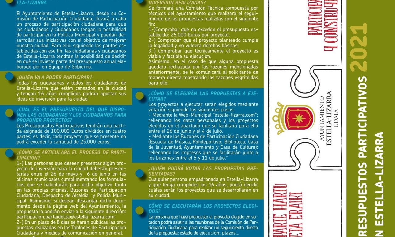 Desde hoy, día 26 de mayo, y hasta el próximo 6 de junio pueden presentarse las propuestas de inversión a los Presupuestos Participativos 2021 del Ayuntamiento de Estella-Lizarra. El proceso, al detalle, lo han presentado esta tarde el concejal de Relaciones Ciudadanas, Unai Errazkin Peña, y el alcalde, Koldo Leoz Garciandia, recordando que estos días se ha enviado la información por carta a los domicilios.