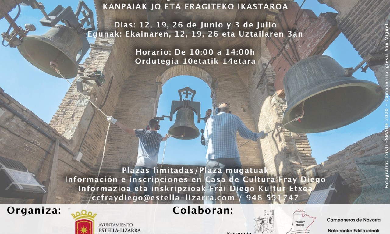 El Ayuntamiento de Estella, en colaboración con la Parroquia de San Pedro de la Rúa y la Asociación de Campaneros de Navarra-Nafarroako Ezkilazainak, han organizado un curso de volteo y repique de campanas. La actividad se desarrollará los días 12, 19 y 26 de junio, además del 3 de julio, de 10 a 14 horas. Las plazas son limitadas y quienes requieran más información, o quieran realizar la inscripción, tendrán que acudir a la Casa de Cultura Fray Diego o ponerse en contacto con el teléfono 948 551747, o a través del mail: ccfraydiego@estella-lizarra.com