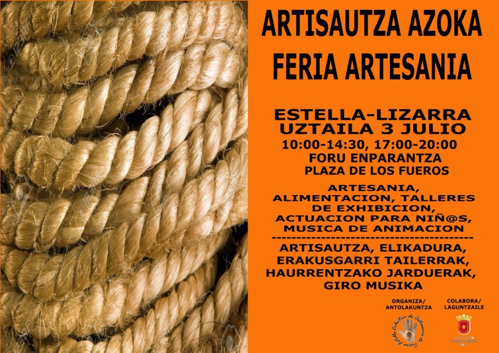 Este sábado, día 3 de julio, la Plaza de los Fueros, acogerá una nueva edición de la Feria de Artesanía que organiza el Colectivo de Artesanos de Tierra Estella, en colaboración con el Ayuntamiento de Estella-Lizarra. La Feria abrirá sus puertas de 10 de la mañana a 14:30h y por la tarde entre las 17 y las 20 h.