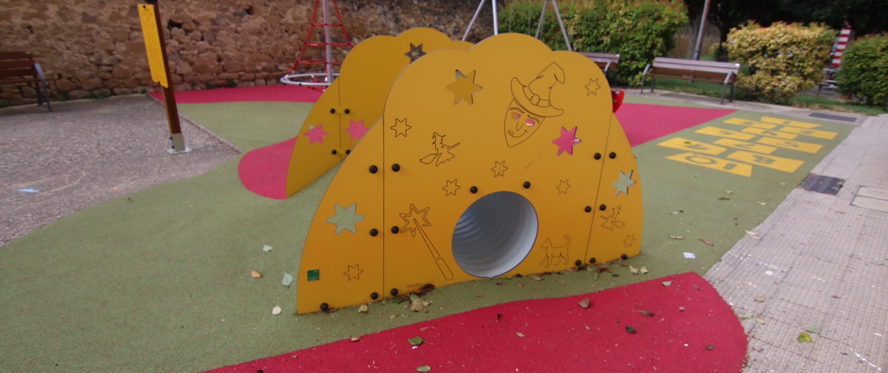 En la Travesía de la Paz, junto a la plaza de toros, se ha instalado el ‘Rincón de la magia’, con un túnel mágico con el que jugar, un balancín, un cono giratorio, una mesa multijuegos con cuatro asientos y un columpio doble con asiento plano y de seguridad para los más pequeños. También en el suelo va un salto de longitud señalizado entre otros juegos.