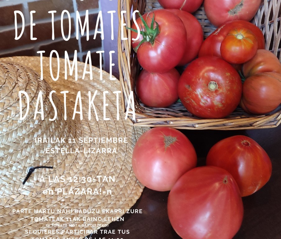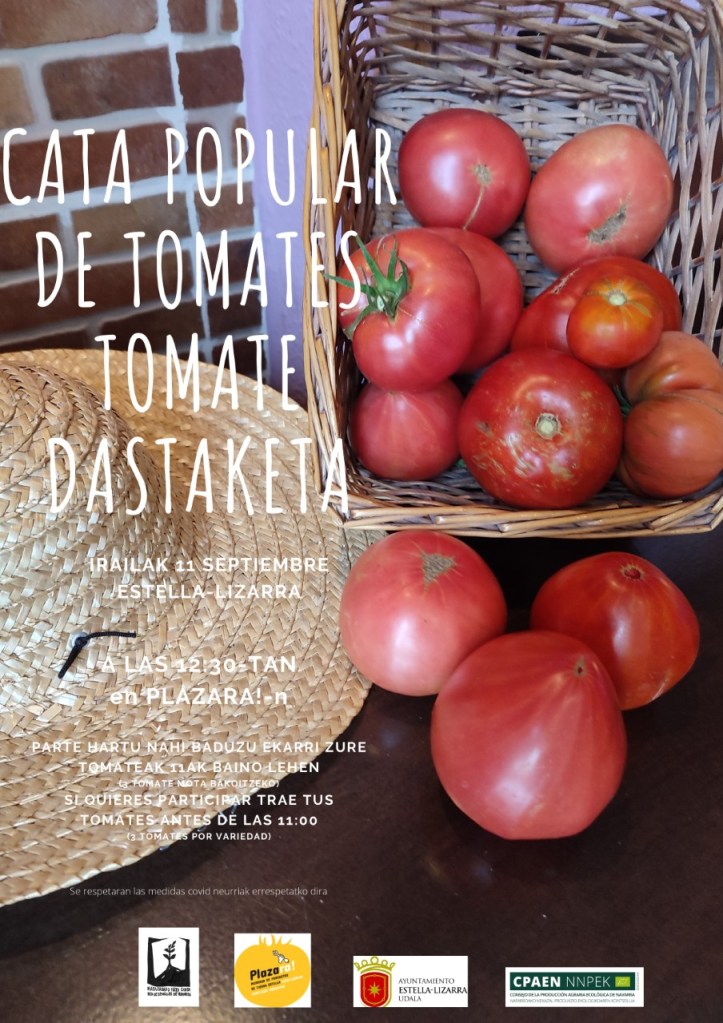 La cata popular de tomates de este sábado, un punto de encuentro e intercambio para quienes se dedican a la horticultura, está organizada por la Red de Semillas de Navarra y comenzará a las 12.30. Quienes quieran participar tienen que entregar sus tomates (3 por variedad) antes de las 11.00 para que dé tiempo a la organización a preparar todo.