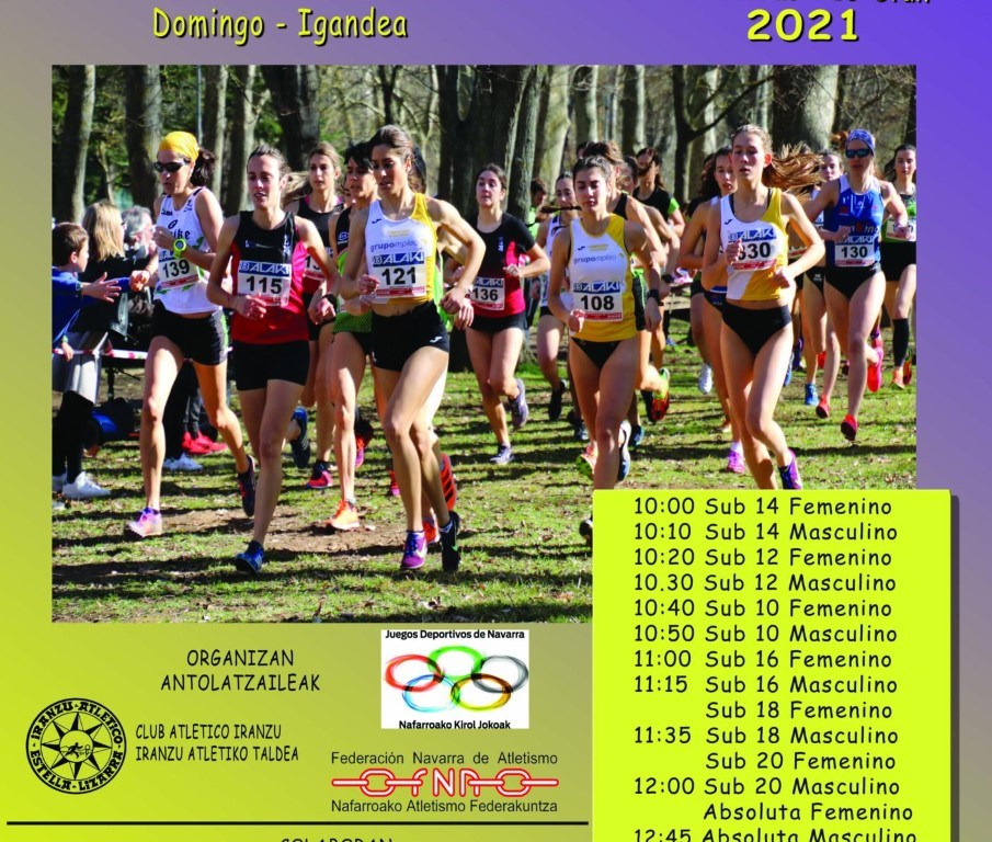 Este domingo 24 de octubre, a partir de las 10 de la mañana, el Club Atlético Iranzu celebrará el XIX CROSS C. A. IRANZU, valedero para el Cto navarro de Cross por equipos en categorías Sub20 y Absoluta. A la vez será la primera jornada de los Juegos Deportivos de Navarra de cross. El desarrollo de todas las pruebas tendrá como escenario el Paseo de Los Llanos.
