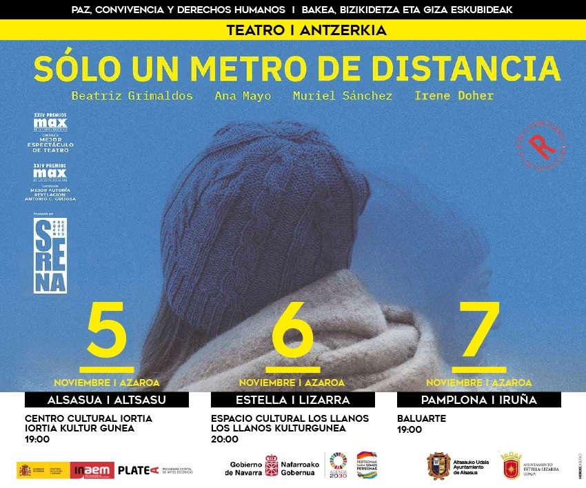 Por su parte, el próximo sábado, día 6 a las 20.00 horas, se pondrá en escena la obra de teato ‘Sólo un metro de distancia’, organizada por la Dirección General de Paz, Convivencia y Derechos Humanos del Gobierno de Navarra. La entrada es gratuita y las invitaciones se pueden recoger desde el día 2 en la Casa de Cultura y el sábado, en el propio Espacio Cultural.