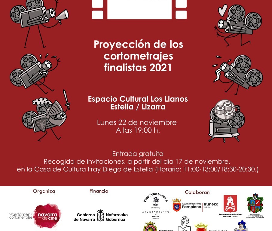 El próximo lunes, día 22 de noviembre, se proyectan en el Espacio Cultural Los Llanos los trabajos finalistas del 9º Certamen de Cortometrajes ‘Navarra Tierra de Cine’. Será a las 19.00 horas, con entrada libre, pero habrá que recoger previamente invitación. Se podrá obtener desde mañana, miércoles, en la Casa de Cultura en horario de 11.00 a 13.00 y de 18.30 a 20.30 horas.